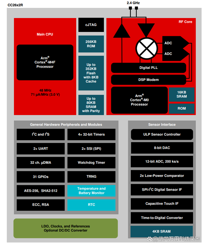 软件控制的专用无线电控制器 (Arm® Cortex®-M0) 提供灵活的低功耗射频收发器功能,支持多个物理层和射频标准(如实时定位 (RTLS) 技术)。